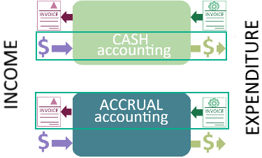- Accrual accounting: this is when invoices are raised. Accruals represent money that you expect to earn and to pay out.