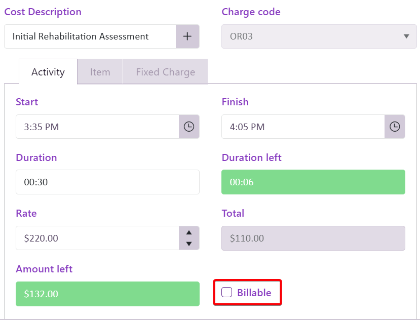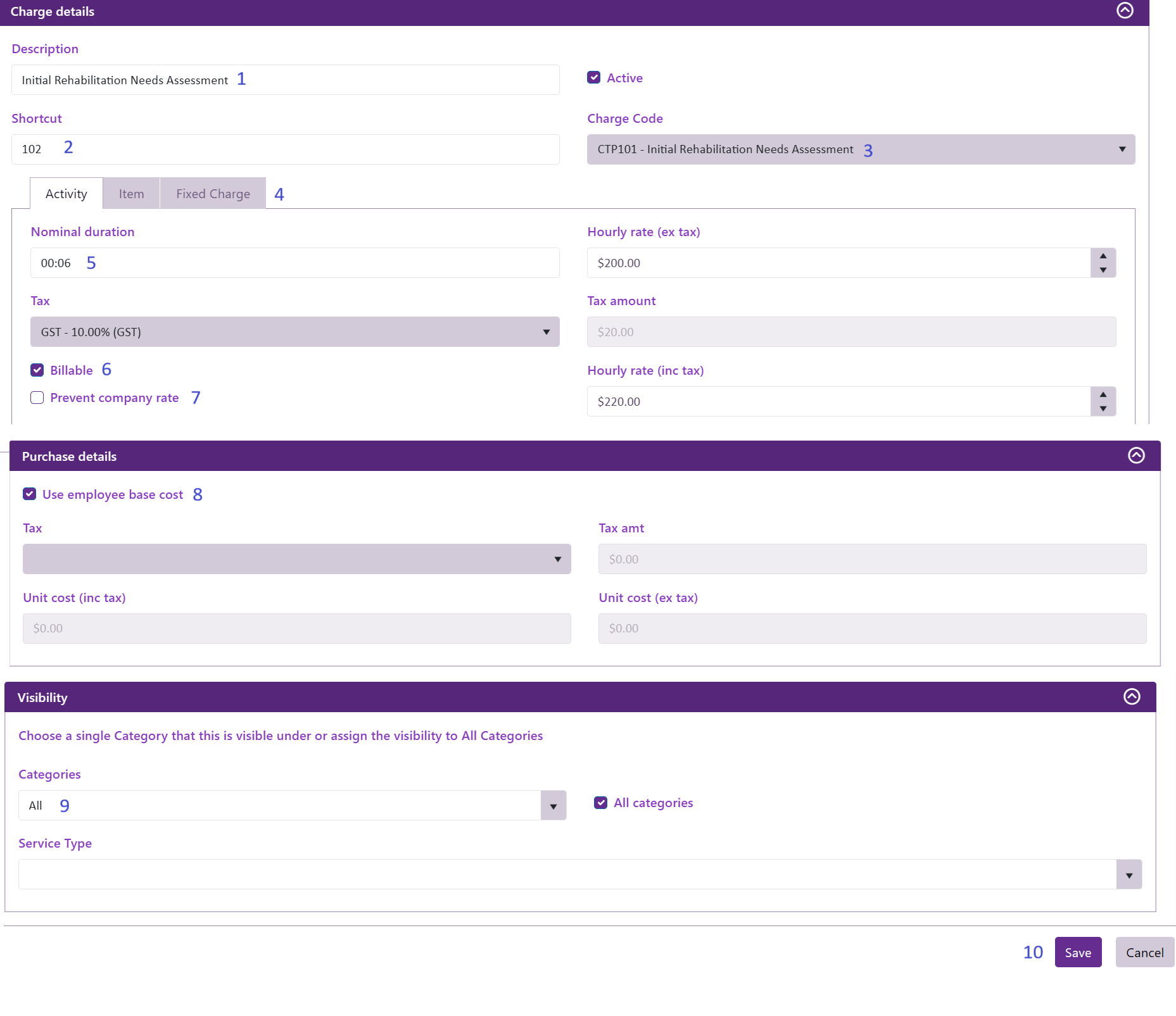 Only charge codes linked to the same categories as the activity (see 8 below) will be available to select.