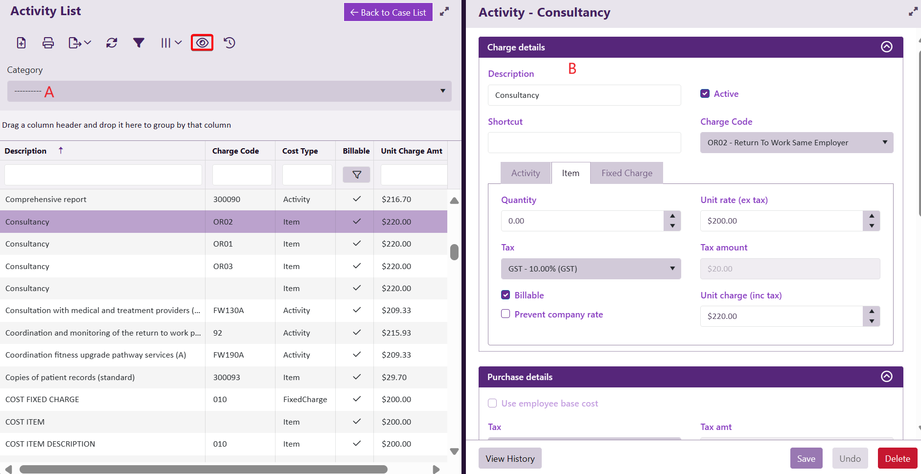 In general, when a new cost is added to a case without an estimate, the activities that can be selected at the case are those linked to the case's category. The selected activity can set many important aspects of what is billed, such as the type of cost, its rate and its charge code.