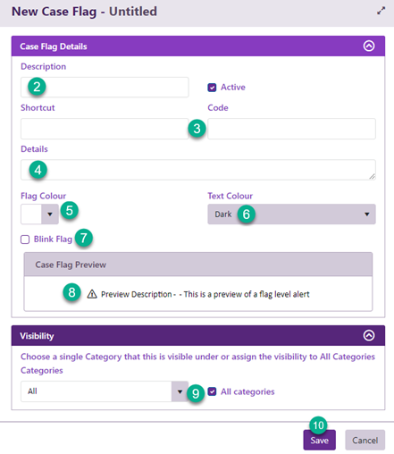 You can create new flags: setting their colour, whether they blink or not, their descriptions, details and their applicability to different case categories.
