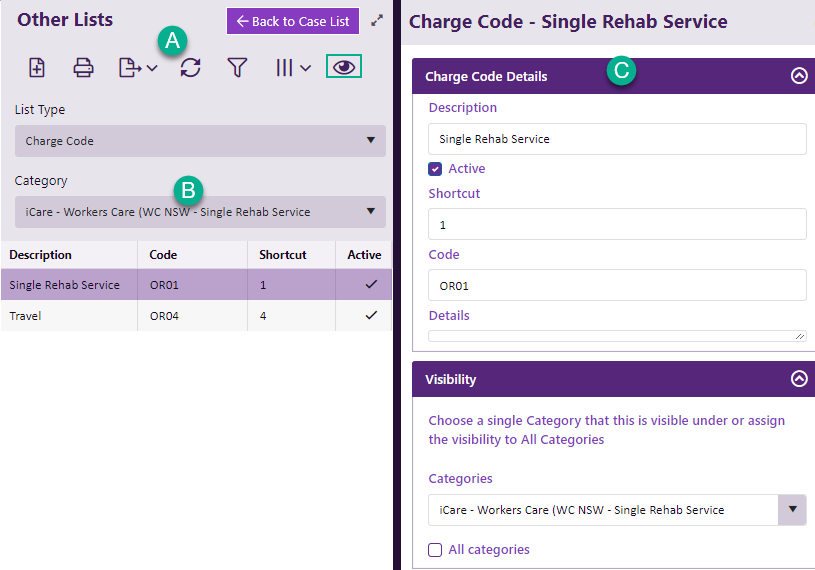 - You can view all charge codes in the list or only those linked to a certain category.