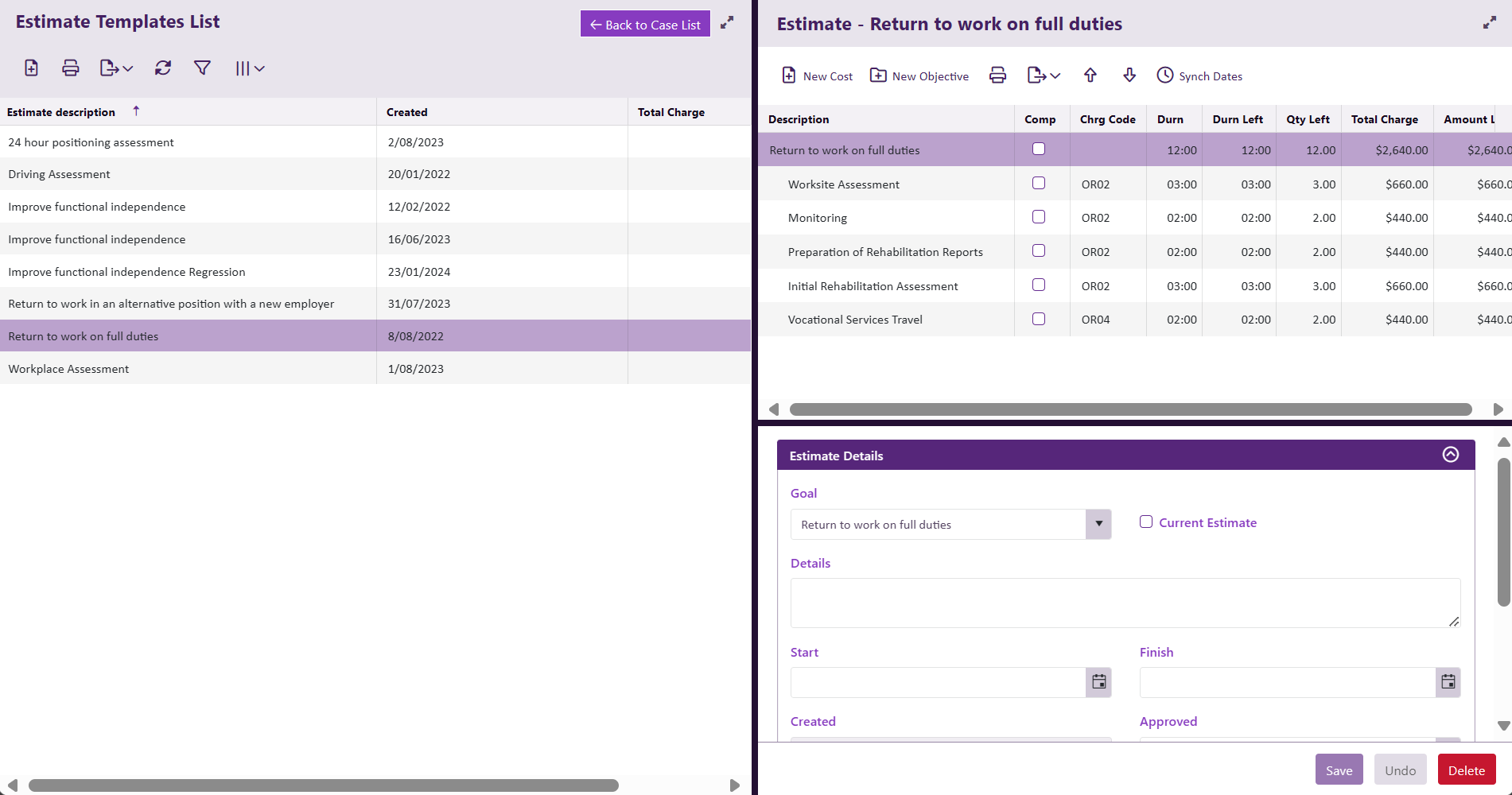 When an estimate is added to a case it can be created from scratch or from a template, which can be customised.