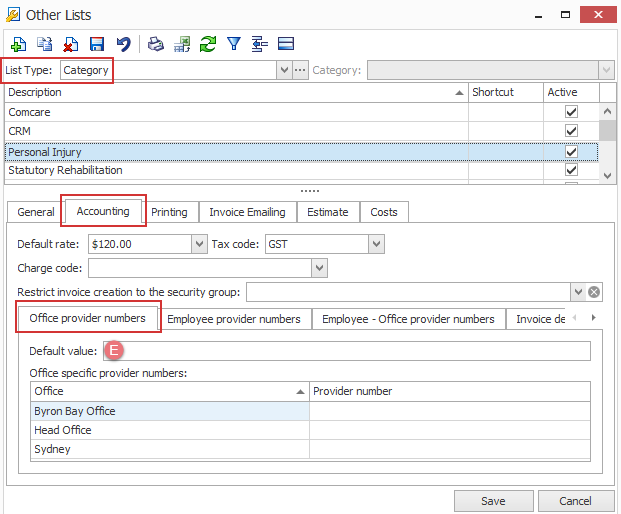 These can be set up at a number of levels in the system in order to meet different requirements for different kinds of cases. Here we will set up the simplest version only, with further details at Provider numbers.