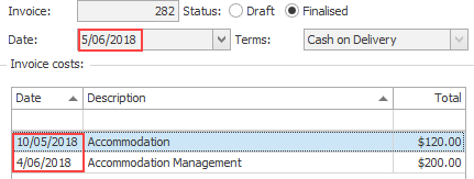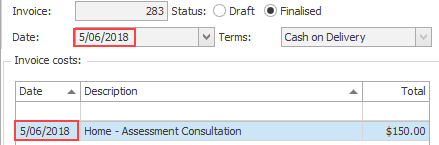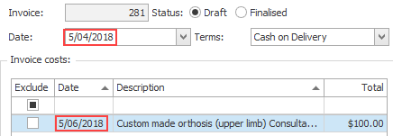 Note also that counter intuitive invoices like the example below may account for comparison discrepancies when the cost date is used. Here the invoice date had been set to earlier than the cost date.