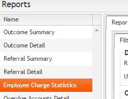 To run the report select View > Reports from the main menu and then click Employee Charge Statistics.