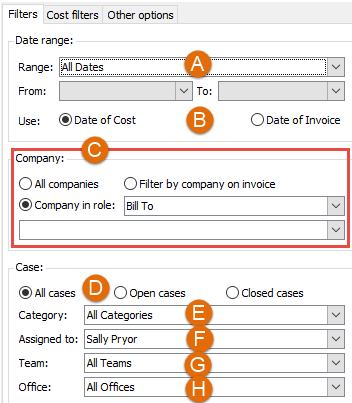 Click the Filters tab. In this tab you specify filters for date, company and case.