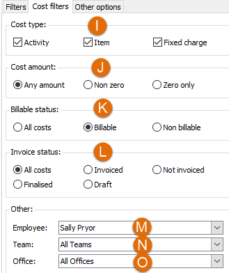 - To produce the same data as the Time sheet, you need to select cases at the Filter tab where the Assigned to is All Employees and ensure that only billable costs are selected at the Cost filters tab.
