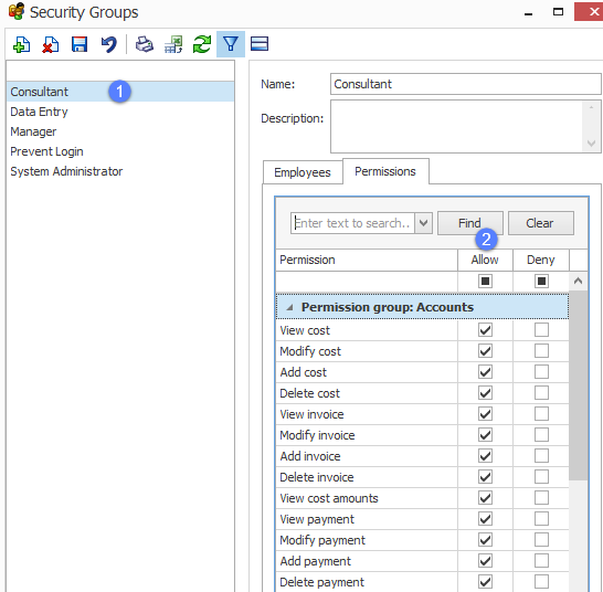 Each security group has settings for all the system permissions. Each permission controls a function, such as View cost. Note that Add cost, Modify cost and Delete cost are three other, independent permissions, so permission settings enable quite detailed regulation of user activities.