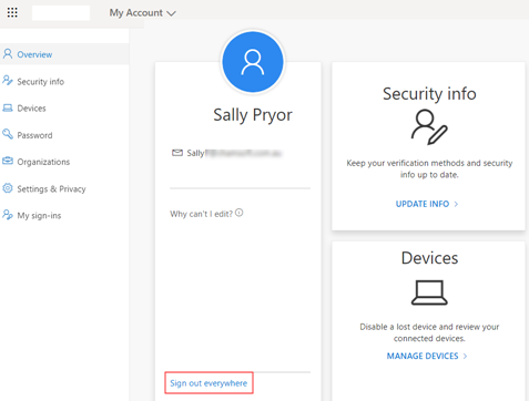 - At the overview screen of the account you want to totally sign out from, click Sign out everywhere.
