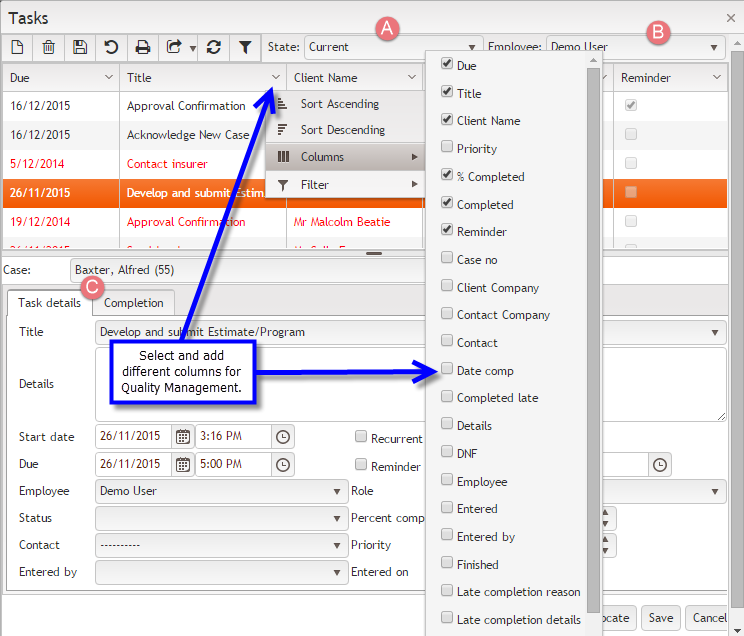 Click here for a video demonstration of the list of Tasks and workflows combining to provide quality management. Note that this is the Windows version of Case Manager, however you should still find it useful.