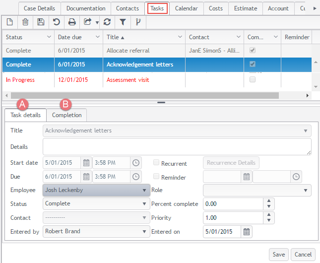 - In the Completion tab you log when a task is completed, see Manage tasks.