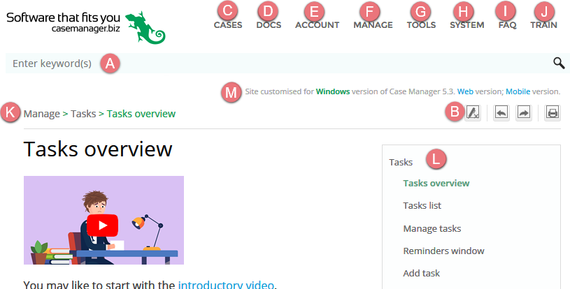 For example, if you wanted to learn about tasks in Case Manager you could start with the overview page and then work your way through each page in the section.