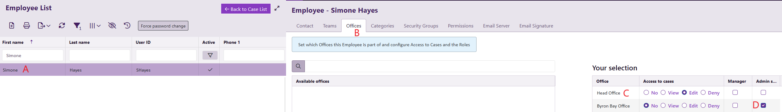For example, below Simone Hayes (A) is selected and we are looking at her office memberships (B). We can see that she has an Office Member role for both Head Office and the Byron Bay Office (C). Additionally she has an Administration Support role for the Byron Bay office (D).