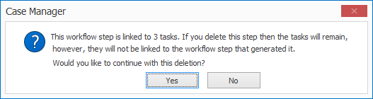 Note that if you do delete a workflow step that is linked to existing tasks, you will also remove the workflow links to these tasks. These tasks are disconnected from the workflow's sequence of steps and their completion will not lead to the creation of any other workflow-generated tasks.