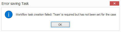 This error tells you that when you tried to complete a workflow-generated task, Case Manager found that the next workflow step was assigned to a team system role. However, no team had been set for this case and there was no fallback employee, so the new task could not be created. Hence you could not complete and save the first task.