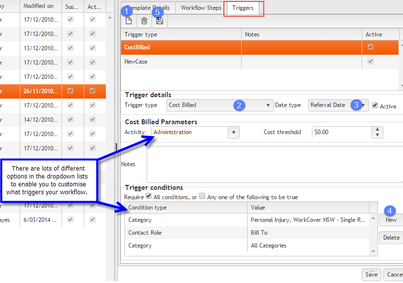 Cost Billed | Workflow template will trigger if the specified cost is added to a case at the Costs tab. You can be more specific and target the moment when this cost reaches a cost threshold. |